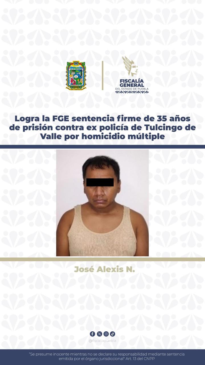 Puebla, Pue., 27 de agosto de 2025 — La Fiscalía General del Estado logró que quedara firme la sentencia de 35 años de prisión en contra de José Alexis N., ex policía municipal de Tulcingo de Valle, tras acreditarse su plena responsabilidad penal en el delito de homicidio calificado en agravio de cuatro personas.