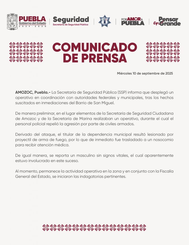 Amozoc, Pue. — La Secretaría de Seguridad Pública del estado de Puebla informó en un comunicado que desplegó un operativo en coordinación con autoridades federales y municipales tras los hechos suscitados en inmediaciones del Barrio de San Miguel.