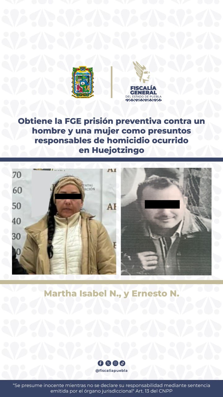 La Fiscalía General del Estado de Puebla logró mediante la aportación de datos de prueba, prisión preventiva contra Martha Isabel N. y Ernesto N., por su probable participación en el delito de homicidio calificado en el municipio de Huejotzingo, Puebla.