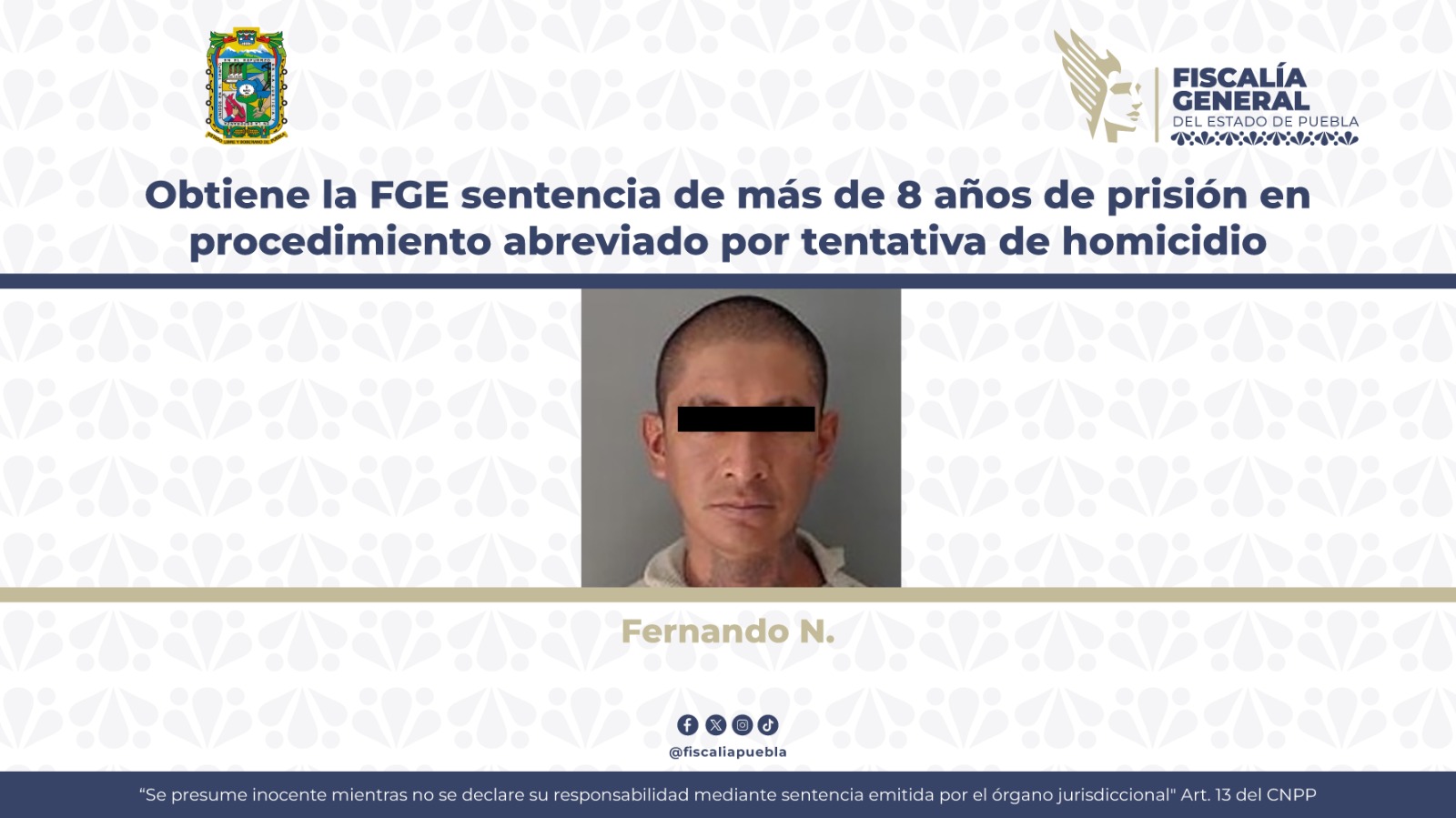 Puebla, Pue. — La Fiscalía General del Estado de Puebla informa que se obtuvo sentencia condenatoria de más de 8 años de prisión, dictada mediante procedimiento abreviado, en contra de Fernando N., al acreditarse su plena responsabilidad penal en la comisión del delito de homicidio calificado en grado de tentativa.