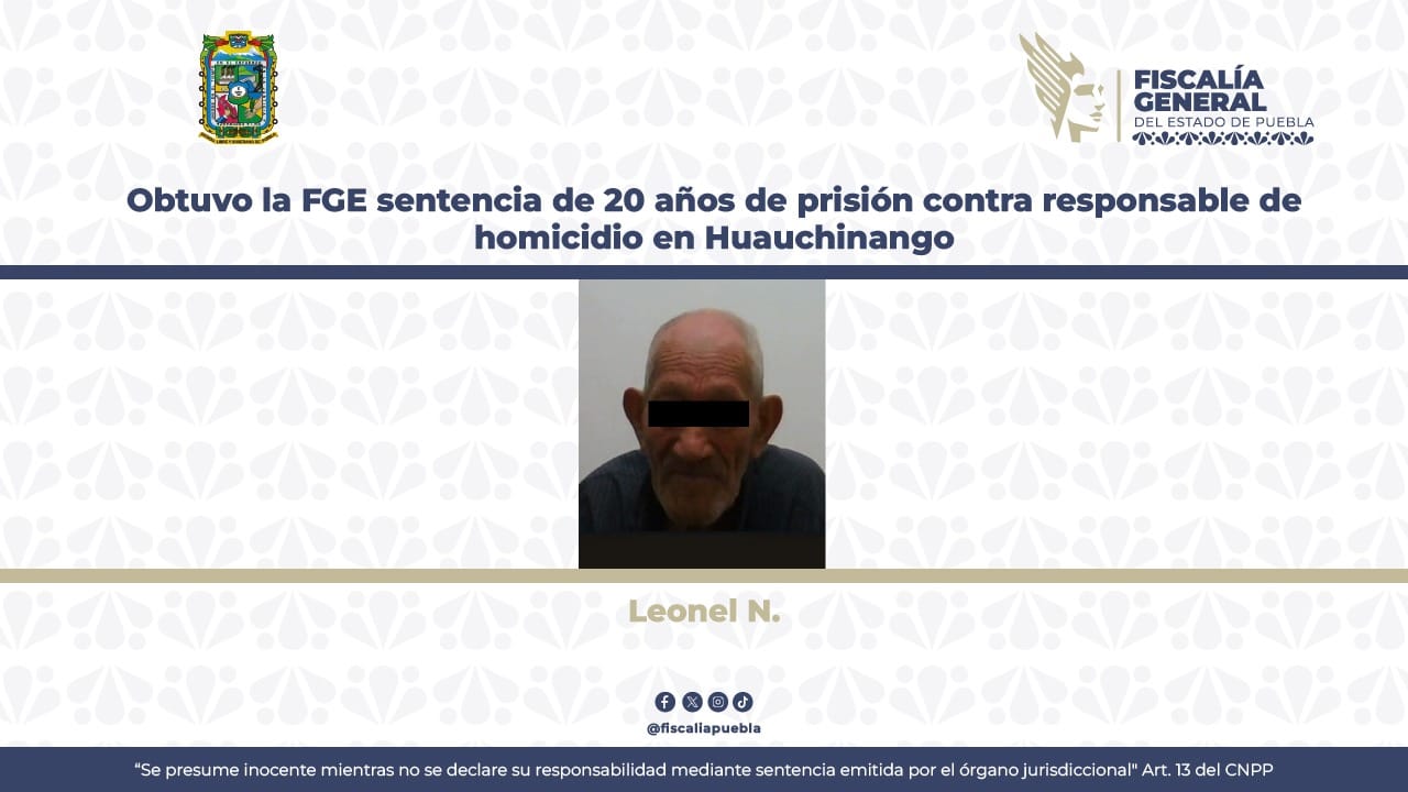 La Fiscalía General del Estado de Puebla, a través del cúmulo de pruebas y argumentos presentados ante la autoridad judicial, obtuvo una sentencia de 20 años de prisión contra Leonel N., por el delito de homicidio calificado, ocurrido en el municipio de Huauchinango.
