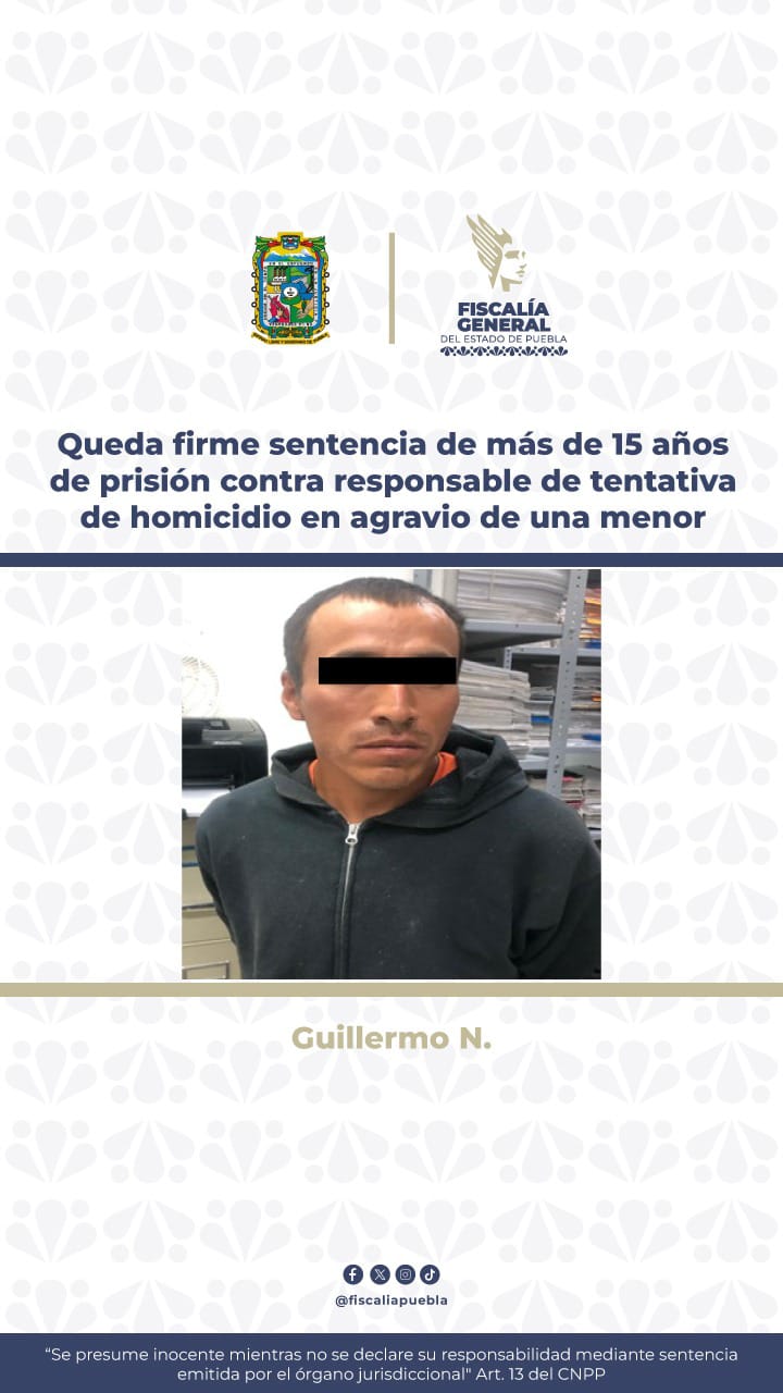 La Fiscalía General del Estado logró mediante la aportación de diversos datos de prueba, que quedara firme la sentencia de más de 15 años de prisión, en contra de Guillermo N., penalmente responsable del delito de homicidio en grado de tentativa, en agravio de una menor de edad, ocurrido en la ciudad de Puebla.