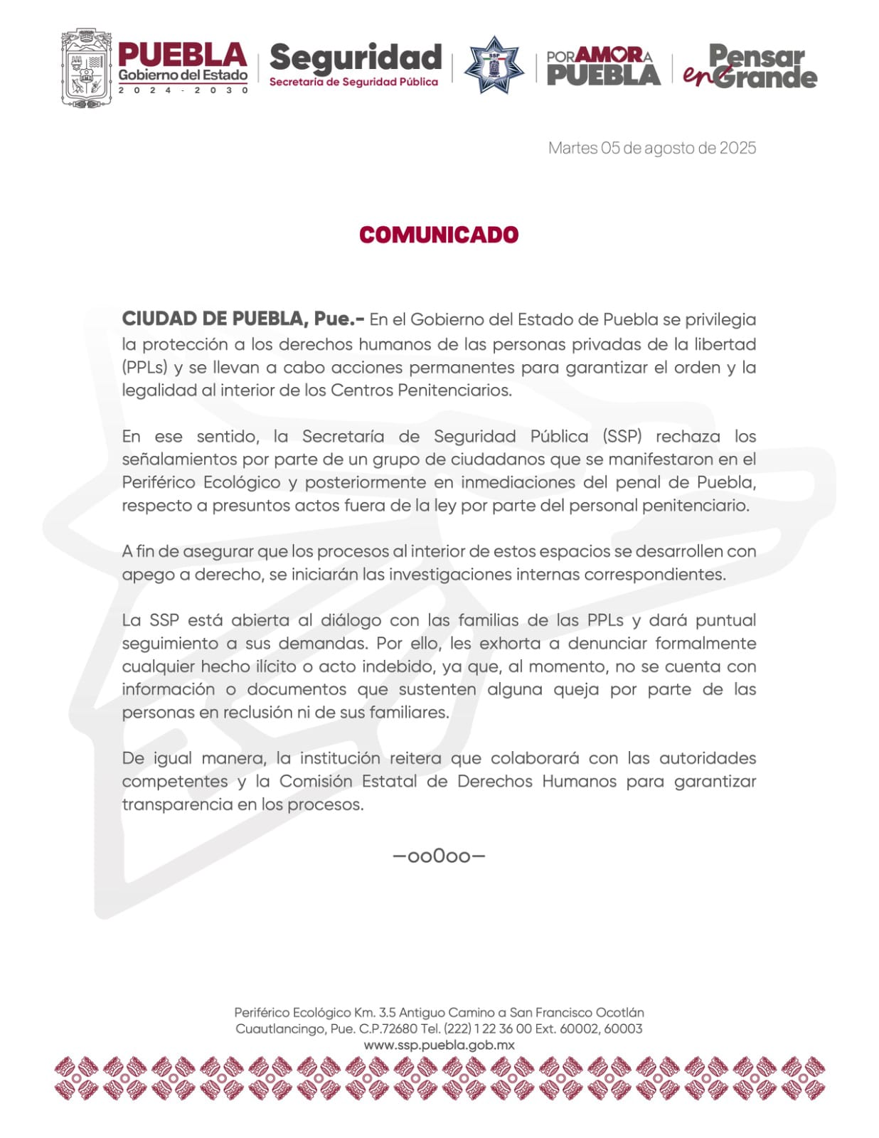 Home / Seguridad / Rechaza la Secretaría de Seguridad acusaciones de familiares de reos. Inicia investigación al interior del penal de San MiguelSeguridadRechaza la Secretaría de Seguridad acusaciones de familiares de reos. Inicia investigación al interior del penal de San MiguelPor Redaccion Editorial No hay comentariosagosto 5, 2025 3:56 pmCompartir notaEtiquetado:AcusacionesDerechos HumanosEstado de PueblaInvestigación en penalPenal San MiguelSSP PueblaPrevious ArticleEl gobernador Alejandro Armenta asegura que obra pública en Puebla se realiza con honestidad y sin saqueoNext ArticleCon seguridad, infraestructura y apoyo al campo, Puebla construye riqueza comunitaria Related Posts Reintegra la Fiscalía General del Estado a tres menores con su m ... octubre 19, 2025 Ordena Juez de Control cateo en inmuebles de la 46 poniente; aseg ... octubre 18, 2025 octubre 17, 2025