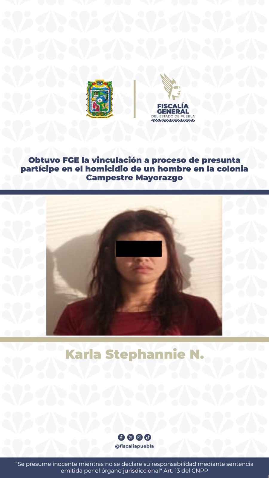 La Fiscalía General del Estado informa que, a partir del análisis integral de indicios y dictámenes periciales incorporados a la carpeta de investigación, se obtuvo la vinculación a proceso y la medida cautelar de prisión preventiva oficiosa en contra de Karla Stephannie N., señalada como probable responsable del delito de homicidio calificado.