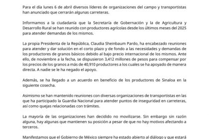 Ciudad de México.- Ante el anuncio de posibles cierres carreteros programados para este lunes 6 de abril por parte de algunas organizaciones del sector agrícola y transportista, el Gobierno de Méxi...