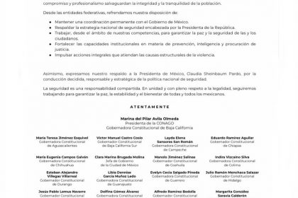 CIUDAD DE MÉXICO (23 de febrero, 2026) – En un mensaje de unidad institucional, los 32 gobernadores y gobernadoras de México, integrados en la CONAGO, emitieron un pronunciamiento conjunto para re...