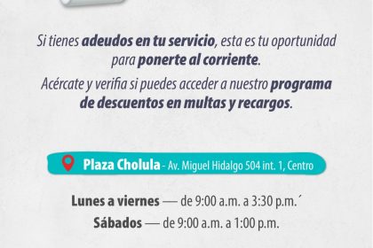 San Pedro Cholula, Pue. — El Sistema Operador de los Servicios de Agua Potable y Alcantarillado de San Pedro Cholula (SOSAPACH) informa a la ciudadanía que se encuentra vigente el programa “Pon t...