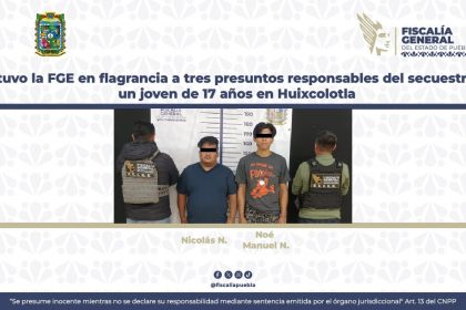 Puebla, Pue. — La Fiscalía General del Estado capturó en flagrancia delictiva a Nicolás N., de 32 años, Noé Manuel N., de 23 años y un menor de edad, como probables responsables del secuestro ...