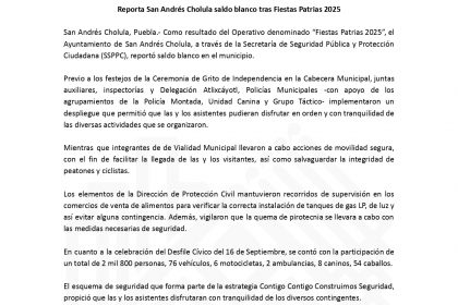 San Andrés Cholula, Pue. — Como resultado del Operativo denominado “Fiestas Patrias 2025”, el Ayuntamiento de San Andrés Cholula, a través de la Secretaría de Seguridad Pública y Protecció...