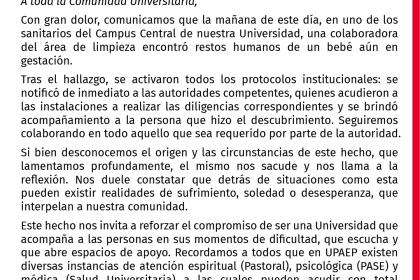 A toda la Comunidad Universitaria, Con gran dolor, comunicamos que la mañana de este día, en uno de los sanitarios del Campus Central de nuestra Universidad, una colaboradora del área de limpieza e...