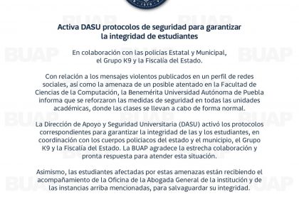 Puebla, Pue. — La Benemérita Universidad Autónoma de Puebla (BUAP) incrementó sus protocolos de seguridad ante las amenazas publicadas en redes sociales, que hablan de un posible atentado en la F...
