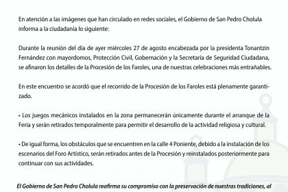 San Pedro Cholula, Pue., 28 de agosto, 2025 — En atención a las imágenes que han circulado en redes sociales, el Gobierno de San Pedro Cholula informa a la ciudadanía lo siguiente: Durante la reu...