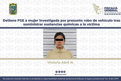La Fiscalía General del Estado de Puebla dio cumplimiento a una orden de aprehensión en contra de Victoria Abril N., por su presunta responsabilidad en el delito de robo de vehículo agravado. De ac...