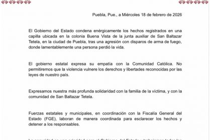 CIUDAD DE PUEBLA, PUE. (19 de febrero, 2026) – A través de un pronunciamiento oficial, el Gobierno del Estado condenó de manera enérgica el ataque armado ocurrido en la capilla de la colonia Buen...