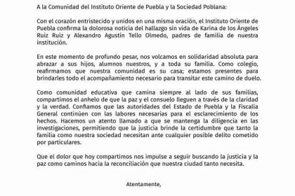 El Instituto Oriente de Puebla confirmó la dolorosa noticia del hallazgo sin vida de Karina de los Ángeles Ruiz Ruiz y Alexandro Agustín Tello Olmedo, padres de familia de su comunidad educativa, y...
