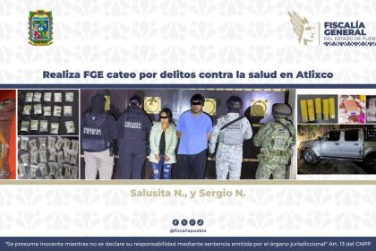 CIUDAD DE PUEBLA, Pue.- La Fiscalía General del Estado de Puebla llevó a cabo un cateo en un inmueble del municipio de Atlixco por su probable relación con delitos contra la salud. La diligencia se...