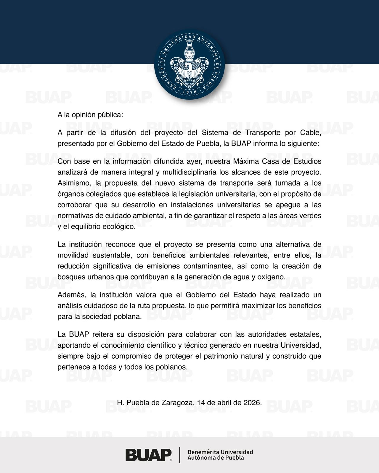 CIUDAD DE PUEBLA, Pue.- Tras la presentación del proyecto del Sistema de Transporte por Cable por parte del Gobierno del Estado, la Benemérita Universidad Autónoma de Puebla (BUAP) informó que realizará un análisis integral y multidisciplinario sobre sus alcances.